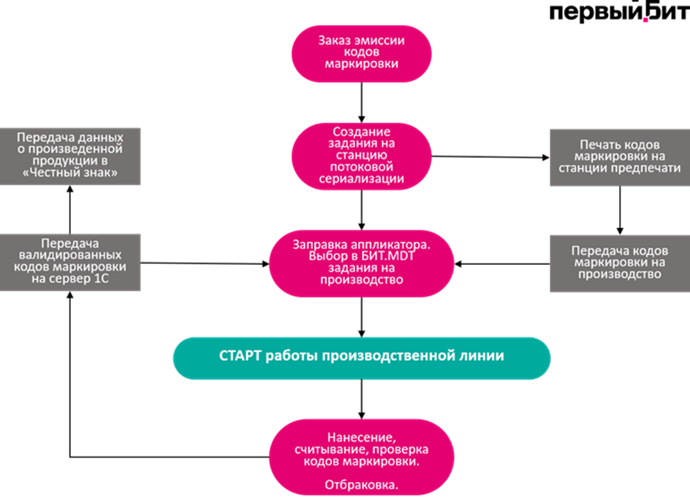 - Заказ эмиссии кодом маркировки происходит на АРМ оператора в «Честный Знак» через программу «1С:Комплексная автоматизация». После чего эмитированные коды маркировки отправляются на станцию предпечати. В это время оператор, используя функционал БИТ.MDT, создает задание на производственную линию (станция потоковой сериализации), и отдает распечатанные коды маркировки на производство.