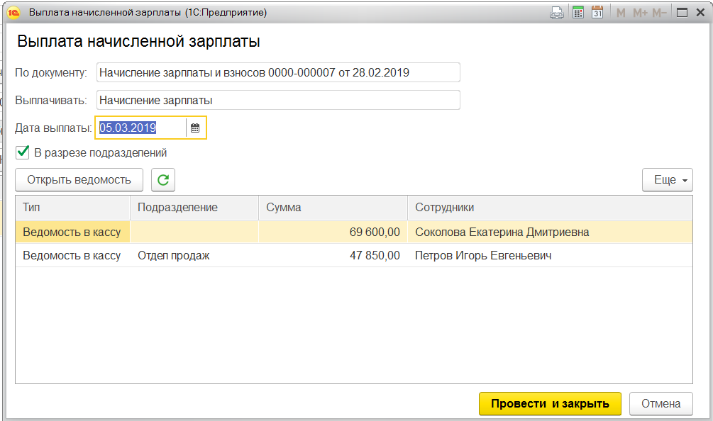 Будет создана ведомость в кассу с видом «начисление зарплаты».