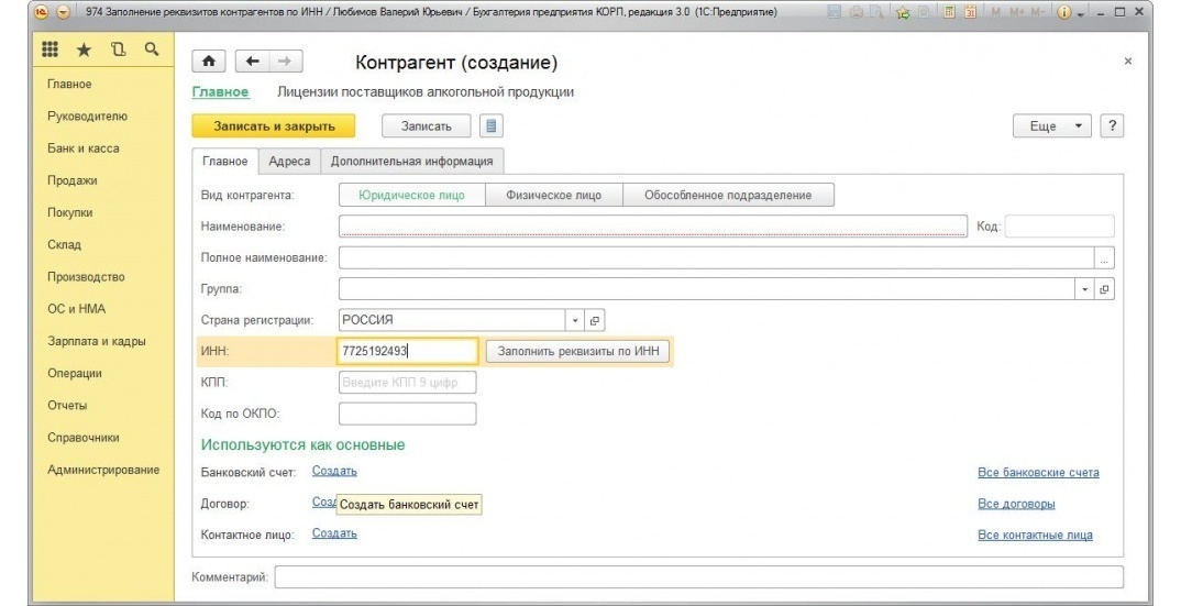 По ИНН данные из реестра заполняются автоматически КПП, краткое и полное наименование, юридический адрес, руководитель компании контрагента.