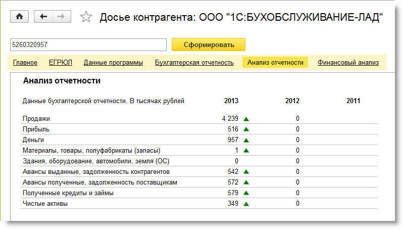• Отчет «Досье контрагента» покажет по любой фирме: все сведения из ЕГРЮЛ, бухгалтерскую отчетность, информацию о проверках госорганами и финансовый анализ деятельности. Можно быстро оценить надёжность контрагента.